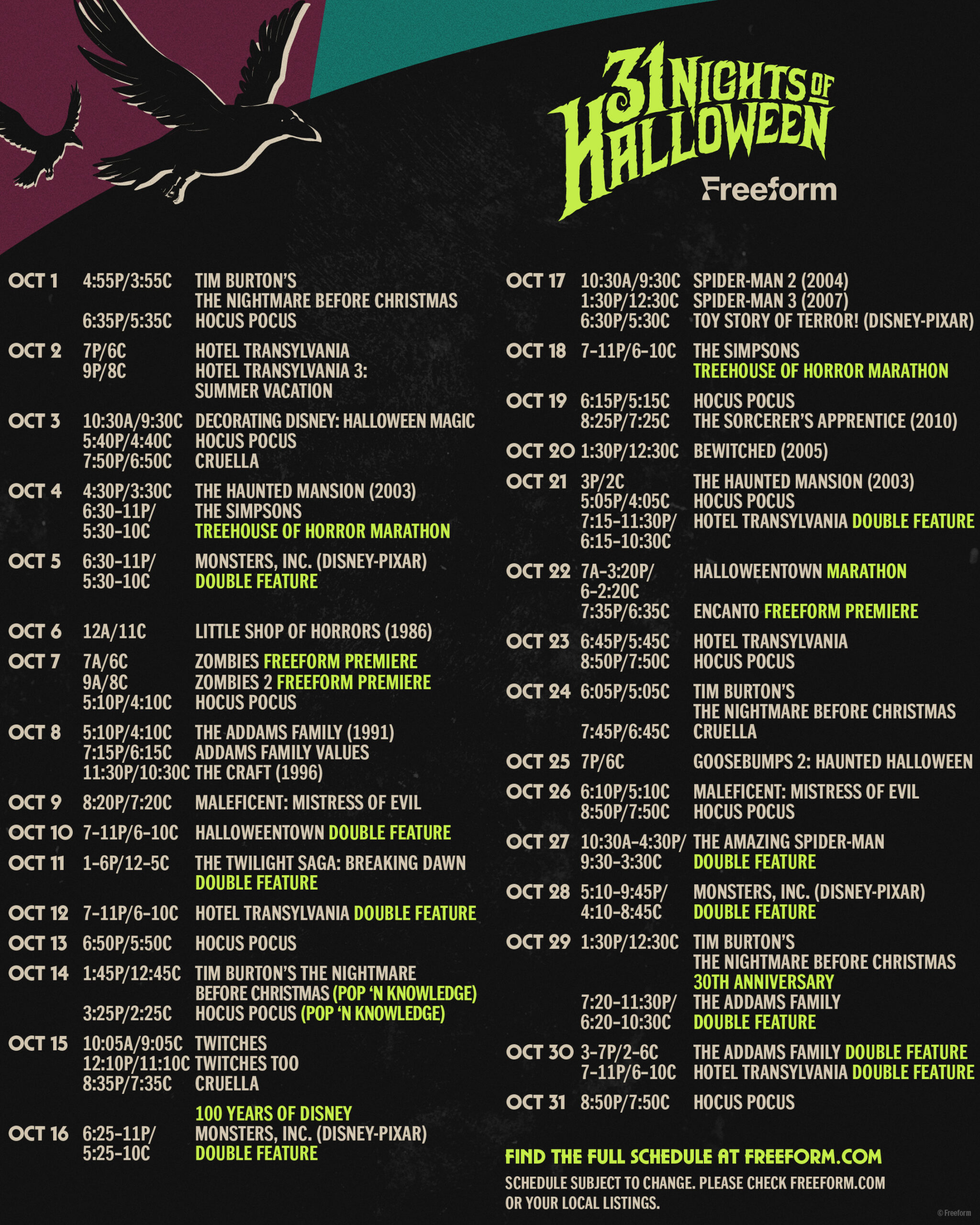 This year Freeform celebrates ghosts and ghouls galore with beloved movies including Hocus Pocus Monsters Inc the 30th anniversary of Tim Burton s The Nightmare Before Christmas The