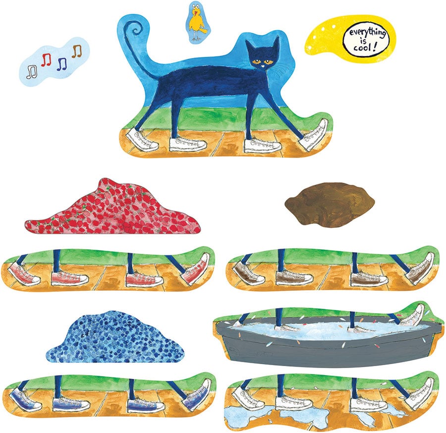 Pete the Cat I Love My White Shoes features simple rhythmic language that children love to sing along with Use this fun sequencing activity to teach your students how to order events and retell a story This activity is a motivating way to deliver ESL material in the practice and presentation in a more exciting way Your students Read the Pete the Cat story I love my White Shoes by James Dean with your child There is an online version of the story available on YouTubeTM which you can access using the URL Set up trays with paint for each colour shown in the story red blue brown and a tray with water