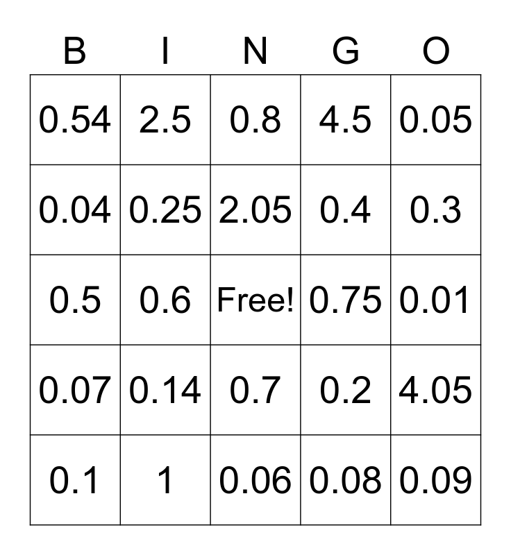 Pdf 294 78 KB This decimal bingo game gives children lots of practice adding decimals and doesn t feel like it relies too much on luck The children can use a host of mental math strategies while playing so it s not just a hunt and cover game The pdf file includes two sets of 6 game boards Print 2 pages of Decimals Bingo Cards for free Download a PDF with 2 free pages of bingo cards plus instructions and a randomized call sheet Customize the events add your own free space change the BINGO header or add a fun checkerboard etc