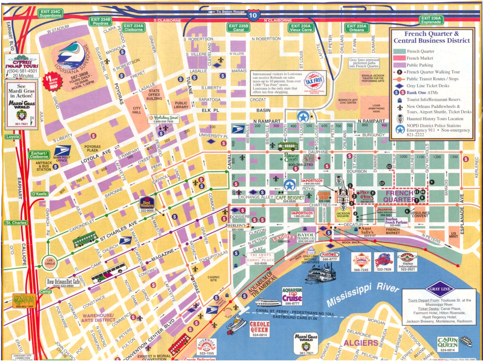 Map of New Orleans area showing travelers where the best hotels and attractions are located Our free French Quarter walking tour map in New Orleans Printable do it yourself guided walking tours of the best sights to see and things to do while walking around Jackson Square and Bourbon Street in New Orleans Louisiana s French Quarter