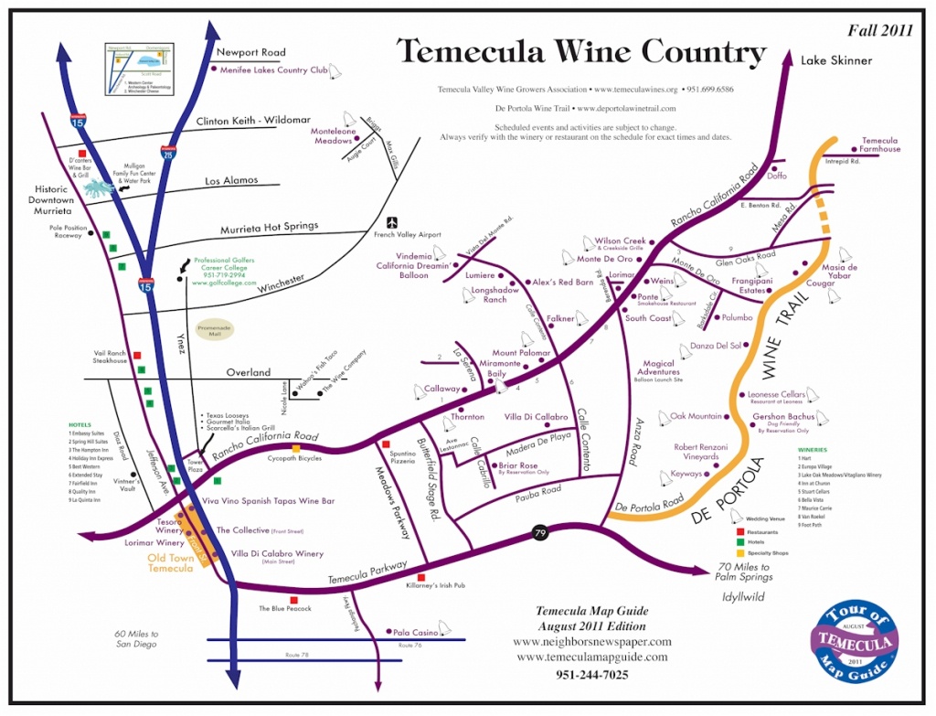 Visitors can tour wine country on their own tasting and sipping at their leisure utilizing our Temecula Winery Map or charter a guided tour of the wineries for the ultimate relaxing splurge Shuttle and limousine transportation options can get your group to and from the region s diverse wineries with ease CWA Editor April 2015 Temecula Valley Winery Map Click Mapfor larger view Map Courtesy of Temecula Map Guide Map Courtesy of the Temecula Valley Winegrowers Association Follow Us
