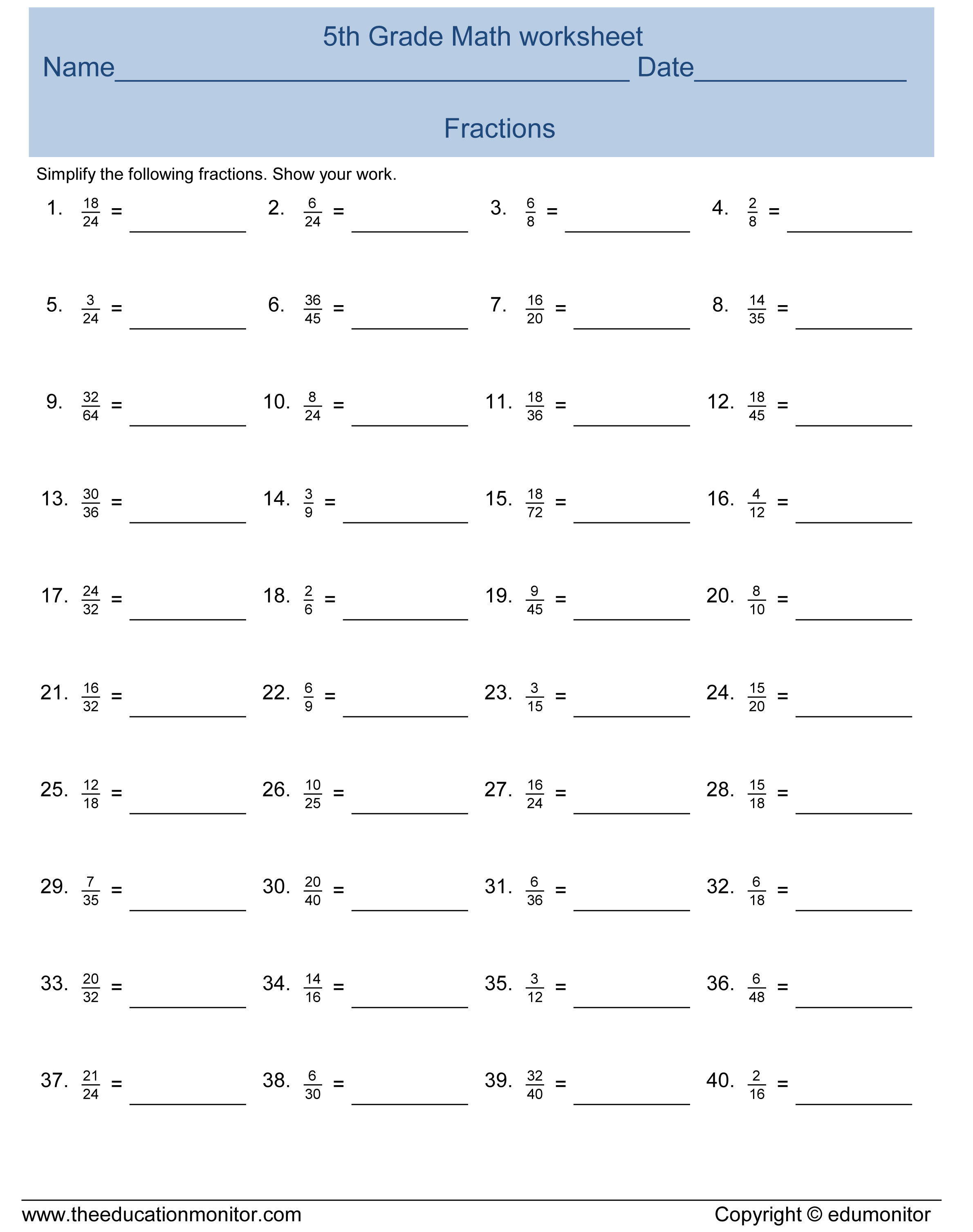 Below are six versions of our grade 5 math worksheet on simplifying proper fractions students must rewrite the fractions if possible in their simplest form form with the lowest possible denominator These worksheets are pdf files Worksheet 1 Worksheet 2 Worksheet 3 Worksheet 4 Worksheet 5 Worksheet 6 5 More