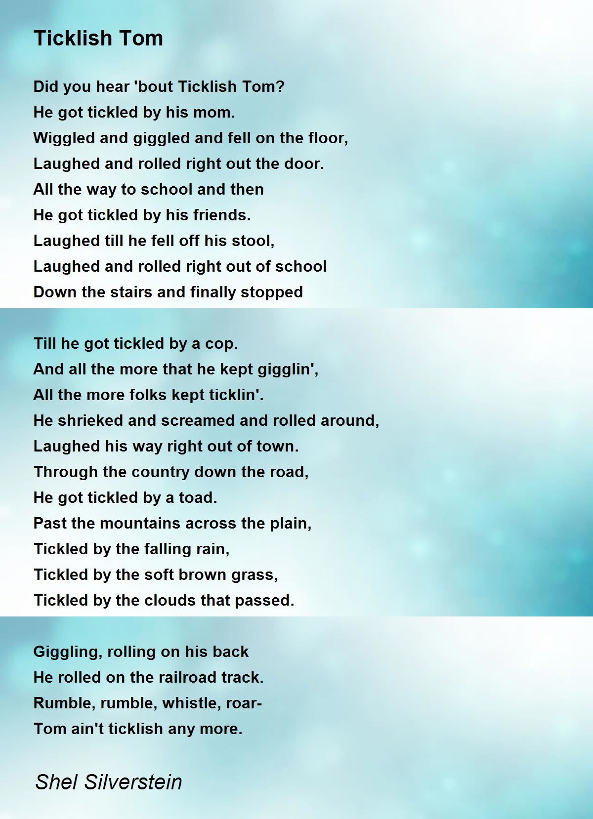 Ticklish Tom by Shel Silverstein Did you hear bout Ticklish Tom He got tickled by his mom Wiggled and giggled and fell on the floor Laughed and rolled right out the door All the way to school and then He got tickled by his friends Laughed till he fell off his stool Laughed and rolled right out of school Down the stairs and finally stopped